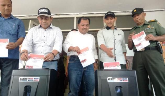 Ketua KPU Kota Tangerang Sanusi Pane bersama Ketua Panwaslu Kota Tangerang Agus Muslim memusnahkan surat suara yang tidak layak pakai atau rusak ke dalam mesin pencacah kertas di pelataran kantor KPU Kota Tangerang, Jum'at (22/6/2018). (TangerangNews.com/2018 / Ahmad Irfan Fauzi)