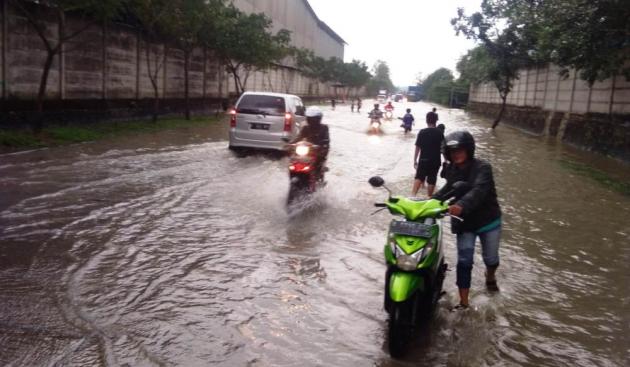 Diketahui, ruas jalan di dekat PT Satyamitra Kemas Lestari (SKL) menjadi langganan banjir, pihak pengelola kawasan industri belum menemukan solusi untuk menanggulanginya.(RAZ/HRU)
