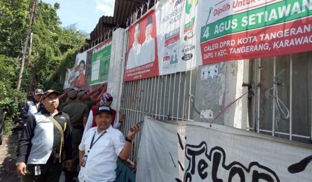 TANGERANGNEWS.com-Badan Pengawas Pemilu (Bawaslu) Kota Tangerang menertibkan alat peraga kampanye (APK) calon legislatif (Caleg) yang melanggar aturan, Jumat (11/1/2019).