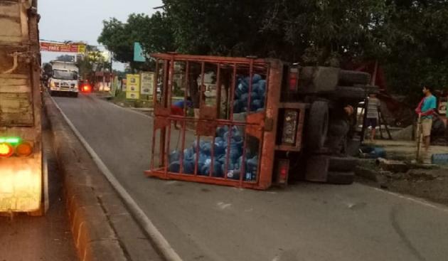 Sebuah truk pengangkut galon mengalami kecelakaan di depan Ruko Showroom Daihatsu di Jalan R.E Martadinata, Pamulang, Tangsel, Jumat (10/5/2019). (@TangerangNews / Rachman Deniansyah)