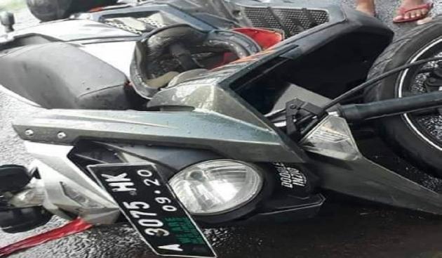 Tampak sepeda motor Yamaha X-Ride nopol A 3075 HK milik korban tergeletak dalam kecelakaan di Jalan Raya Serang-Cilegon, Jumat (14/6/2019). (Istimewa / Istimewa)