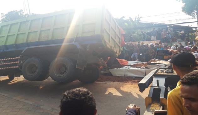 Sebuah truk tanah mengalami peristiwa kecelakaan dan menimpa satu unit mini bus, di Jalan Imam Bonjol, Karawaci, Kota Tangerang, Kamis (1/7/2019). (@TangerangNews / Achmad Irfan Fauzi )