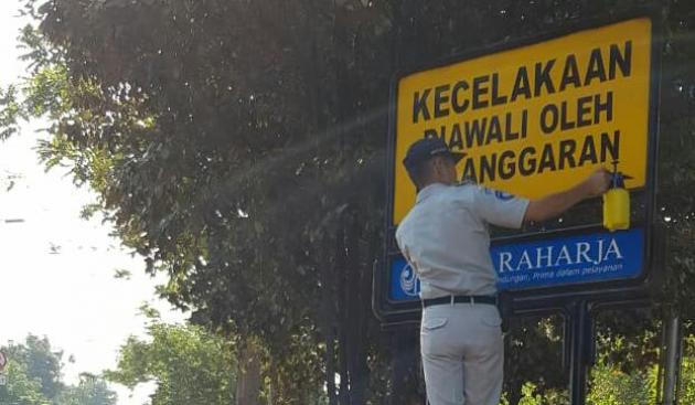 TANGERANGNEWS.com—PT Jasa Raharja (Persero) melakukan kegiatan 'Rambu Bersih Untuk Keselamatan lalu Lintas' secara serentak di seluruh Indonesia, Kamis (8/8/2019).