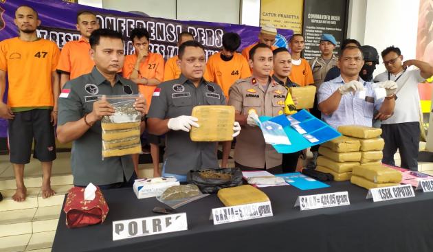 "Dari tangan para tersangka kami berhasil menyita narkoba jenis sabu seberat 424,05 gram dan ganja seberat 5.129,51 gram atau sekitar 5,1 kilogram," jelas Waka Polres Tangsel Kompol Arman di Mapolres Tangsel, Jalan Promoter, Lengkong Gudang Timur, Serpong, Tangsel, Jumat (16/8/2019).