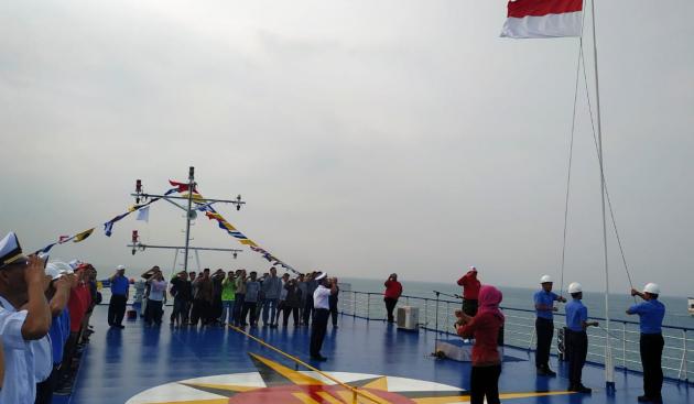 ABK dan Penumpang Upacara HUT Ke-74 RI di Atas Kapal Lintasi Selat Sunda
