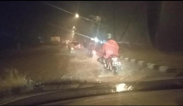 Curah hujan yang cukup tinggi pun membuat sebagian jalan raya Pemda Tigaraksa tergenang.