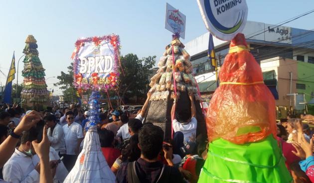 Dalam kirab tersebut, ratusan peserta yang berasal dari unsur pemerintah dan masyarakat berjalan beriringan sambil membawa gunungan dan tumpeng.