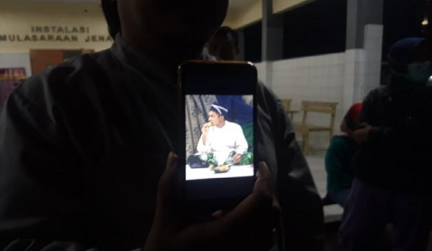 Isep Muhaimin menunjukkan foto semasa hidup Suhendi Ferdiansyah, suporter Persita Tangerang yang tewas dikeroyok. (@TangerangNews / Achmad Irfan Fauzi)
