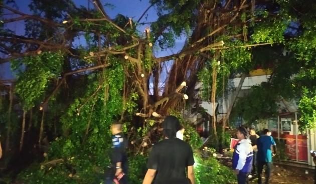 Akibatnya, pohon yang usianya ditaksir mencapai 30 tahun itu menimpa dua bangunan minimarket yang terletak tak jauh dari stasiun.