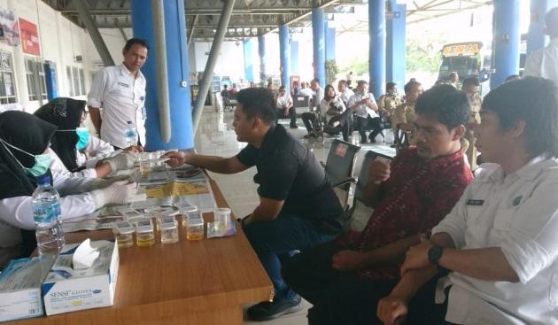Puluhan sopir bus di terminal Merak, Banten dites urine oleh petugas gabungan dari Badan Narkotika Nasional (BNN) dan Polres Cilegon. (Istimewa / Istimewa)