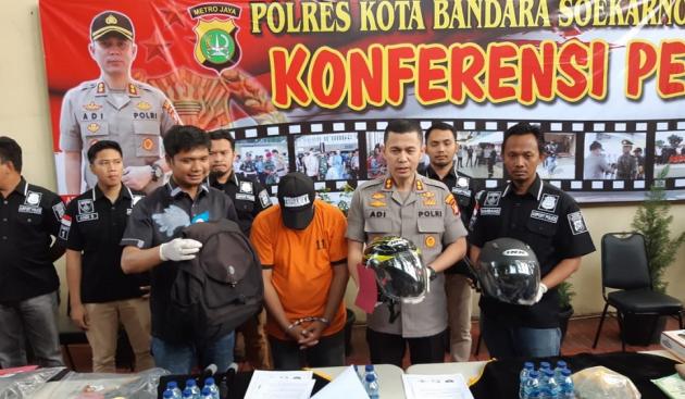 Konferensi pers penangkapan spesialis maling helm berinisial AAM, 32, di Mapolres Kota Bandara Soetta, Tangerang, Jumat (27/12/2019). (@TangerangNews / Achmad Irfan Fauzi)