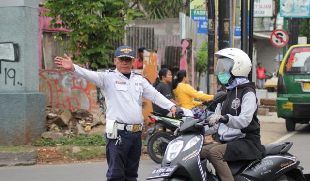 Kabid Lalu Lintas Dinas Perhubungan Kota Tangerang Andhika Nugraha saat mengatur lalu lintas di jalan raya Kota Tangerang. (TangerangNews/2019 / Achmad Irfan Fauzi)
