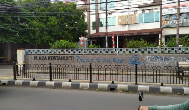 Coretan itu diantaranya bertuliskan 'Islam Zionis', 'Fuck The System', coretan berlambang Bintang Daud dengan kata 'UIN' di tengahnya, serta 'Police is the real teroris'.