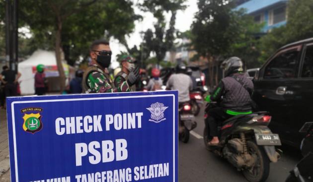 Pemberlakuan PSBB di posko check point Sandratek, Jalan Ir. H. Juanda, Ciputat Timur, Tangerang Selatan. (@TangerangNews / Rachman Deniansyah)