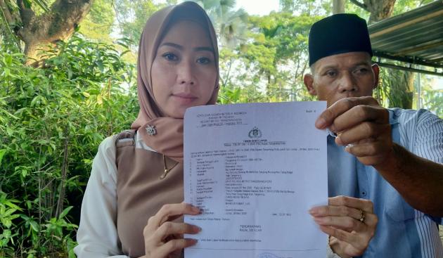 Yanah Apriyanti, istri siri anggota DPRD Kabupaten Tangerang menunjukkan surat laporan kepolisian kasus dugaan penganiyaan, Selasa (19/5/2020). (@TangerangNews / Achmad Irfan Fauzi )