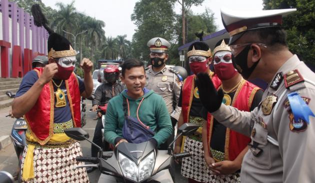 TANGERANGNEWS.com-Satuan Lalu Lintas Polresta Tangerang Polda Banten mengedukasi masyarakat untuk tertib berlalu lintas melalui cara yang unik. Senin (27/7/2020), beberapa personel Satlantas Polresta Tangerang berdandan khusus layaknya tokoh punakawan. Kegiatan itu merupakan bagian dari Operasi Patuh Kalimaya 2020.