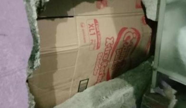 Tampak tembok dapur yang dijebol ditutupi kardus, setelah pelaku pencurian malancarkan aksinya di indekost di Desa Talagasari, RT 3/5, Kecamatan Cikupa, Kabupaten Tangerang. (Istimewa / Istimewa)
