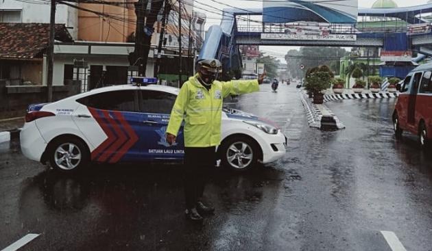 Anggota polisi lalu lintas saat mengarahkan pengendara ke jalur yang dapat dilintasi kendaraan dengan normal, Selasa (16/2/2021). (@TangerangNews / Achmad Irfan Fauzi )