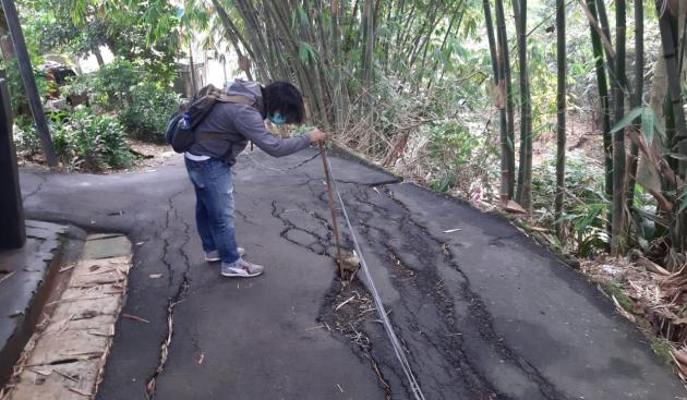 Sementara ini dengan peralatan seadanya, Akhyar berinisiatif untuk memasang tanda menggunakan potongan bambu dan tali pada retakan tersebut.