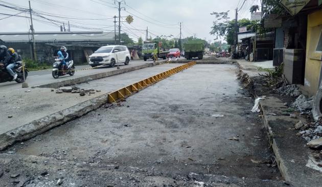 Perbaikan jalan dilakukan sepanjang 300 meter. Kendaraan yang melintas di lokasi harus mengurangi kecepatan dan berhati-hati dikarenakan jalur terbagi menjadi dua.