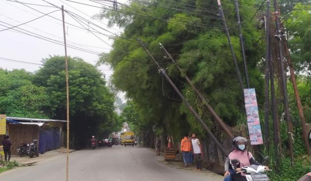 Akibat kondisi tiang yang nyaris rubuh, kabel-kabel yang tersambung pun ikut menjuntai berantakan, melintang di badan jalan.