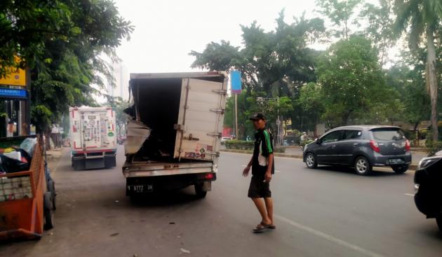 Satu unit mobil box mengalami kerusakan bagian belakang insiden truk bermuatan tanah menabrak dari arah belakang di Jalan Raya Jendral Sudirman pada pukul 16.10 WIB, Kamis 17 Juni 2021. (@TangerangNews / Faisal Fazri)
