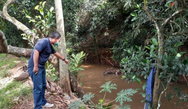 Warga setempat saat menunjuk tempat pelaku terjun ke kali angke, Tangerang Selatan, Kamis, 24 Juni 2021. (@TangerangNews / Rachman Deniansyah)