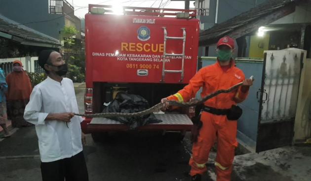 TANGERANGNEWS.com-Petugas Dinas Pemadam Kebakaran dan Penyelamatan Kota Tangerang Selatan kembali berhasil mengevakuasi seekor ular jenis sanca yang menyelinap masuk ke rumah warga.