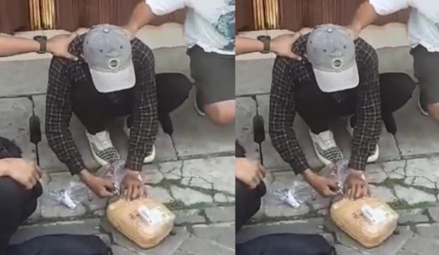 Tangkapan layar seorang pria penerima ganja yang dikirim melalui jasa ekspedisi saat diringkus anggota kepolisian yang sedang menyamar menjadi warga biasa. (@TangerangNews / Achmad Irfan Fauzi )