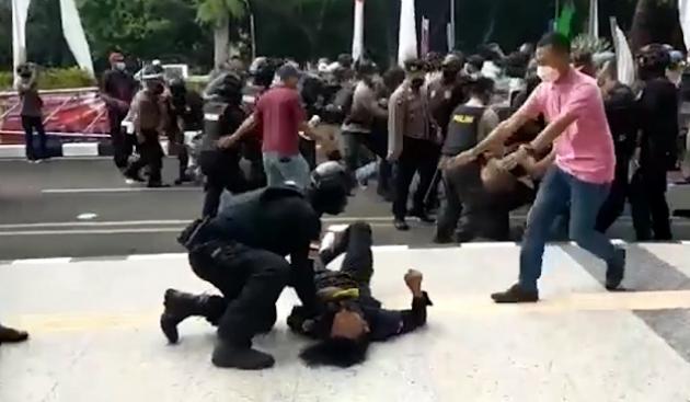 Tangkapan layar aparat polisi melakukan tindakan represif kepada mahasiswa dalam pengamanan aksi demo di depan Pusat Pemerintahan Kabupaten Tangerang, Rabu 13 Oktober 2021. (@TangerangNews / Achmad Irfan Fauzi )