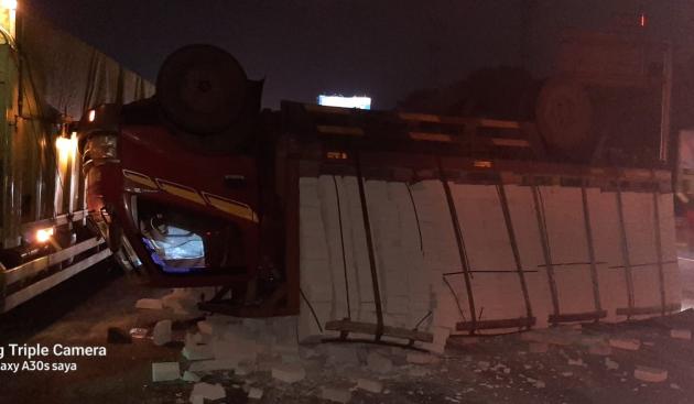 TANGERANGNEWS.com-Kecelakan lalu lintas kembali terjadidi Tol Jakarta-Tangerang. Kali ini satu unit truk bermuatan hebel terbalik di KM 16 lajur Tangerang arah ke Tomang, Kamis 21 Oktober 2021.