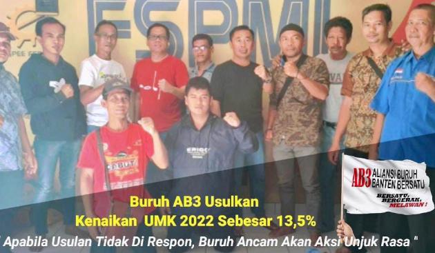 AB3 meminta untuk tahun 2022 upah minimum provinsi (UMP) Banten naik 8,95% dan upah minimum kota/kabupaten (UMK) se-Banten naik 13,50%.