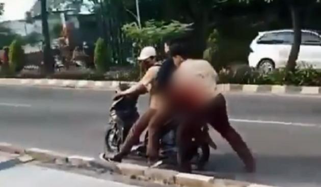 Tangkapan layar salah satu pelajar saat menaiki kendaraan roda dua dengan kondisi bersimbah darah akibat sabetan senjata tajam. (@TangerangNews / Rachman Deniansyah)