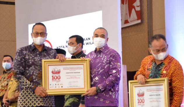 Penghargaan tersebut diserahkan oleh Dirjen Aptika Kemenkominfo Samuel A. Pangarepan kepada Bupati Tangerang A. Zaki Iskandar di ICE BSD Pagedangan Kabupaten Tangerang, Selasa 14 Desember 2021.