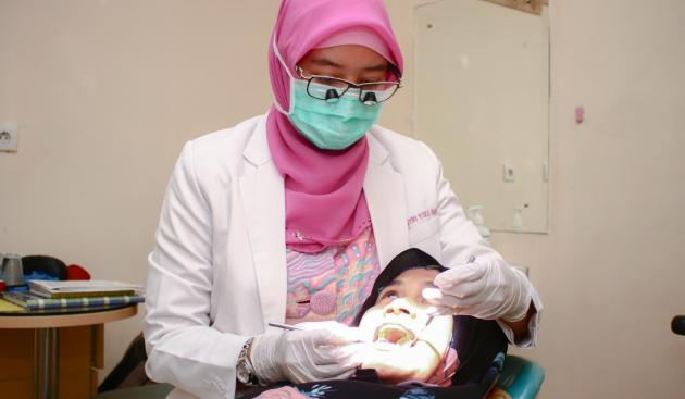 Dokter Gigi RS Sari Asih Karawaci drg. Astrid Diwiyacitra. C.I saat memeriksa kondisi gigi pasienya. (@TangerangNews / Rangga A Zuliansyah)