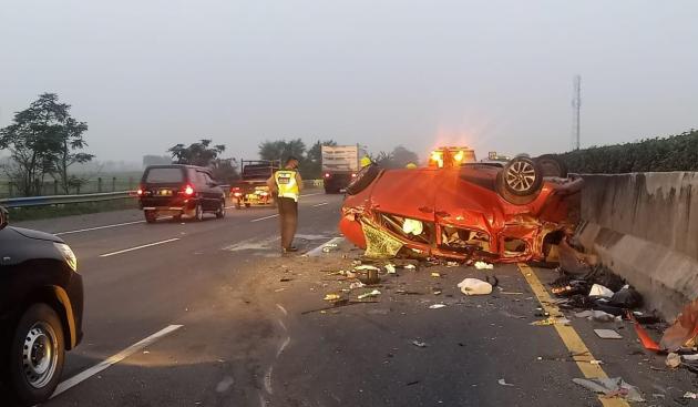 Dia menjelaskan, kendaraan pertama Toyota Sienta mengalami kecelakaan tunggal yang diduga karena mengantuk hingga akhirnya terbalik melintang di lajur tiga.