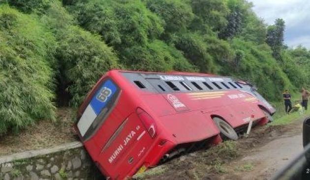 TANGERANGNEWS.com-Bus Murni Jaya rute Labuan-Kali Deres mengalami kecelakaan tunggal di Tol Jakarta Tangerang, Karawaci KM 23, Senin 14 Februari 2022, siang. Bus tersebut terperosok ke parit di sisi kiri jalan.