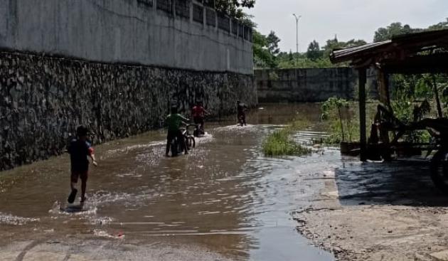 Banjir yang merendam jalanan di Kampung Gunung Batu, Desa Cijantra, Kecamatan Pagedangan, Kabupaten Tangerang tidak kunjung surut. (@TangerangNews / Rangga A Zuliansyah)