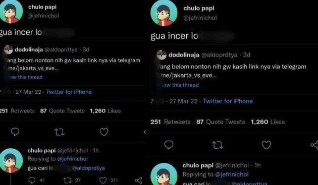 Tweet itu lalu di-reply Jefri Nichol melalui akun pribadinya @jefrinichol, Minggu 27 Maret 2022. Dia mengatakan akan mencari penyebar link tersebut disertai dengan makian.