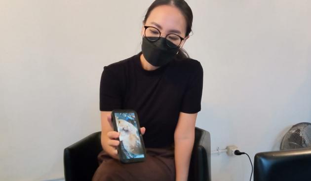 Cristine, warga asal Kecamatan Cipondoh, Kota Tangerang saat menunjukan foto seekor anjing didalam ponsel miliknya. (@TangerangNews / Achmad Irfan Fauzi )