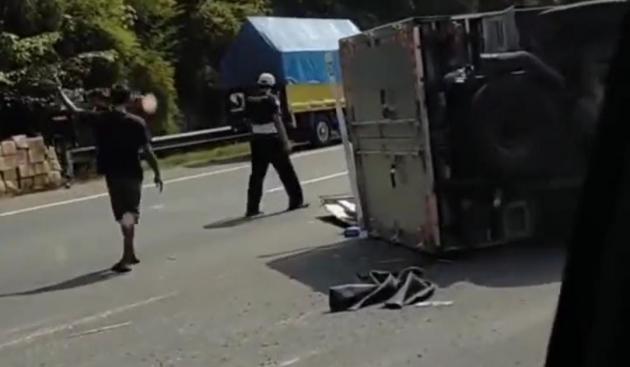 Dari video yang beredar di media sosial, truk bernopol B-9120-BCL itu terguling dengan posisi akhir bagian kiri terbalik di lajur dua. Bagian atap boks mobil terbuka hingga sejumlah muatannya berserakan ke jalan. Selain itu kaca depan truk pecah.