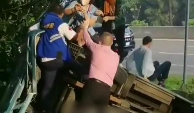 Mini Bus Terbalik di Exit Tol Pondok Ranji Tangsel, WNA Bantu Evakuasi Korban
