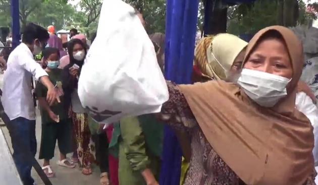 Meski harus membawa serta anak-anak, warga yang merupakan peserta Permodalan Nasional Mandiri (PNM Mekar) ini mengantre, untuk menukarkan kupon yang telah dibeli menjadi paket sembako murah.