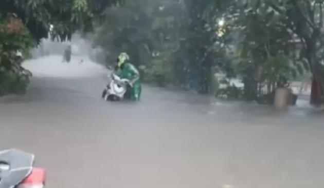 Adapun banjir juga diketahui terjadi di Perumahan Bona Sarana Indah, Kota Tangerang. Di titik ini, ada sejumlah warga yang harus mendorong sepeda motornya karena diduga mogok.