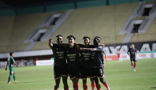 Tim Persita Tangerang merayakan gol dalam laga kontra PSS Sleman di Stadion Maguwoharjo pada Kamis, 29 September 2022 malam. (Media Persita / @TangerangNews.com)