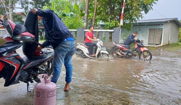 Tak jarang ketika banjir tiba, banyak pengendara sepeda motor yang memaksakan untuk melintas. Sebab, tidak banyak pilihan alternatif jalan lain. Hasilnya, sepeda motor yang dikendarai pun mogok.