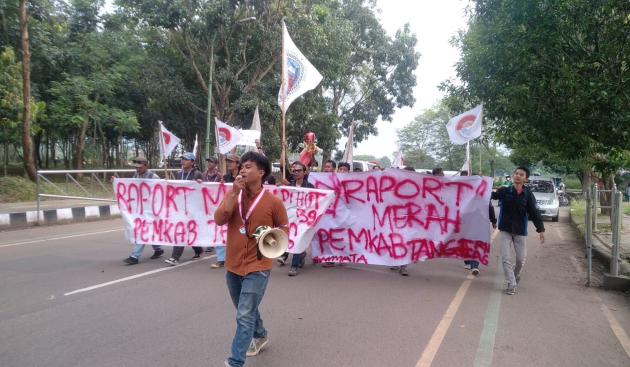 Dalam aksinya, sekitar 50 mahasiswa itu membeberkan rapor merah Pemerintah Kabupaten (Pemkab) Tangerang selama dua periode kepemimpinan Bupati Tangerang Ahmed Zaki Iskandar dan Wakil Bupati Tangerang Mad Romli.
