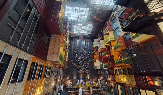 Selain itu, di bagian lobi dihiasi beberapa mural menarik. Sementara di area publik berada di tengah bangunan serta dikelilingi kontainer. Di sini ada meja dan kursi artistik serta kursi sofa bundar warna-warni, lalu di dekat kamar mandi ada tempat selfie menarik yang memberi kesan seperti berada di musim gugur.