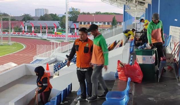 Petugas kebersihan dari Pemkot Tangerang saat membersihkan tribun Stadion Benteng Reborn untuk menjaga kenyamanan selama masa Porprov VI Banten. (Pemkot Tangerang / @TangerangNews.com)