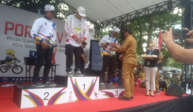 Penyerahan medali kepada atlet cabor BMX Porprov VI Banten di Stadion Benteng Reborn Kota Tangerang, Selasa, 22 November 2022. (Achmad Irfan Fauzi / @TangerangNews.com)